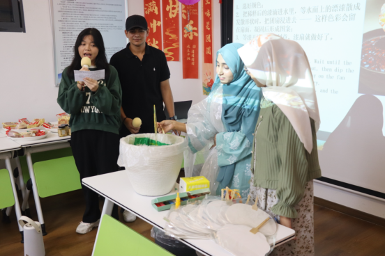红灯笼、玉兔灯与中秋主题对联相映成趣,活动现场节日氛围浓郁。在“华裳体验”环节,2025级临床医学专业留学生们兴致勃勃地换上汉服,讲解汉服的历史,指导同学们学习行礼姿态。来自爱尔兰的留学生SAIFULLAH SANAULLAH(崔俊明)整理着衣袖,兴奋地说:“穿上这身衣服,好像瞬间走进了中国古诗里的场景”。在“甜蜜滋味”美食体验环节,2024级临床医学专业留学生们介绍了中秋节的起源、传说和传统习俗。在大家品月饼、桂花蜜的同时,留学生们介绍了月饼、桂花蜜的种类、文化寓意。在“匠心工巧”环节,2023级临床医学专业留学生们讲解了漆扇的历史、工艺特点和艺术价值,还带领大家体验漆扇制作。活动现场还穿插了中秋文化知识竞答,现场气氛热烈欢快。